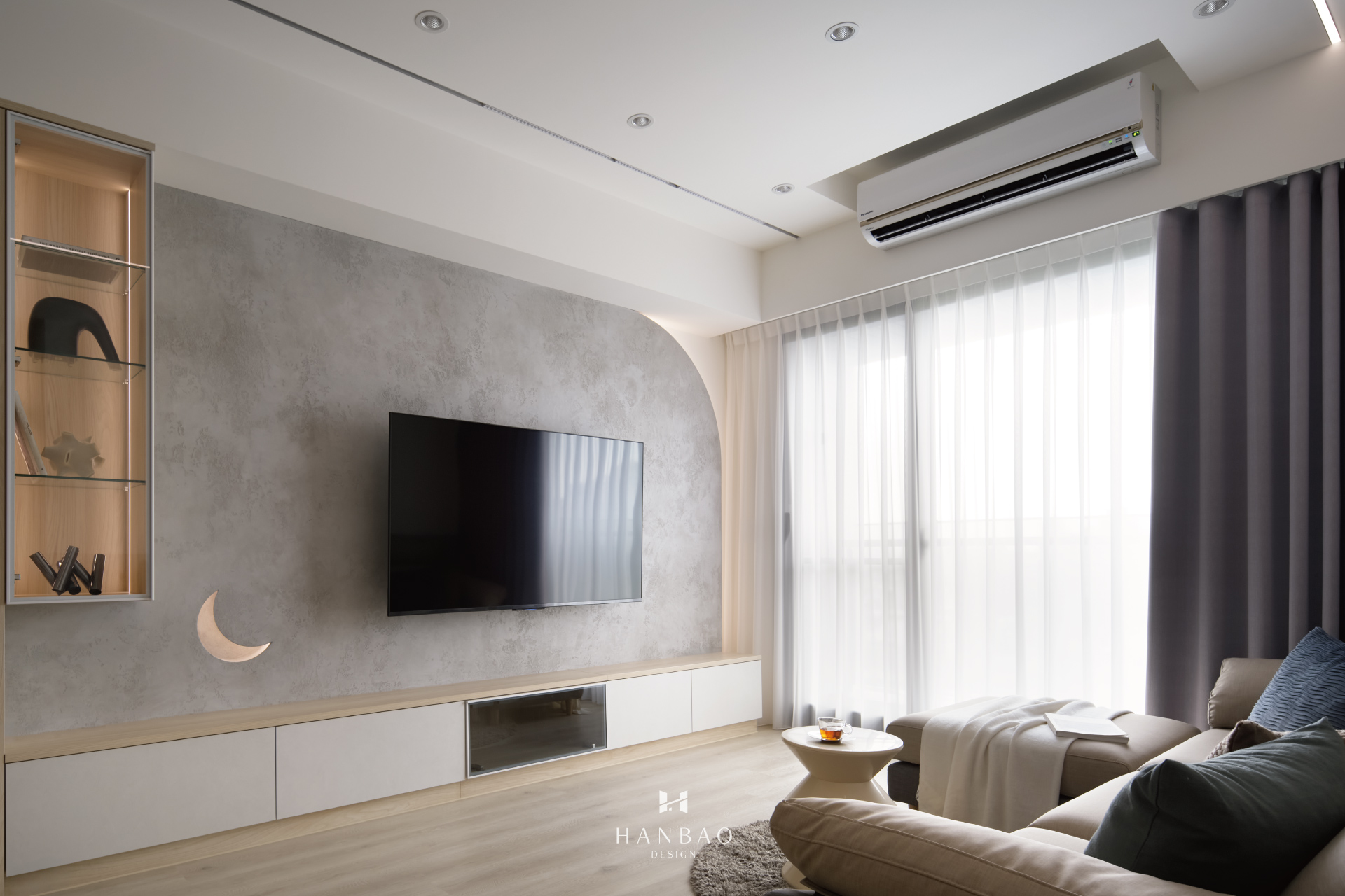 電視牆以圓弧元素為特色,透過圓潤的轉角過渡,使整體視覺更加柔和,消除傳統直線設計的生硬感