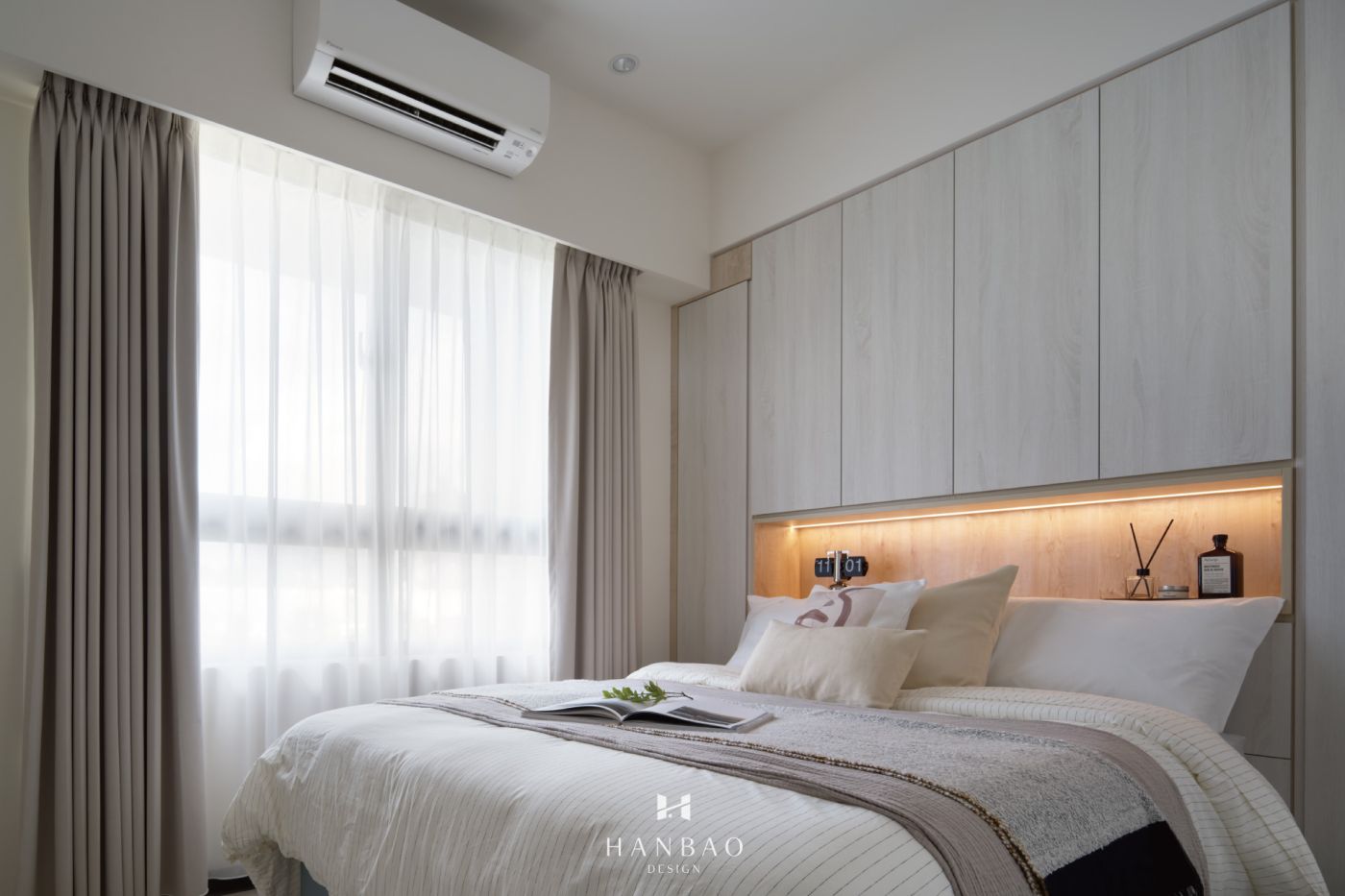 善用樑下空間設計床頭櫃,預留可放置手機、手錶、插座等小物的空間,可以在床上放鬆滑手機時,保持充沛的電力