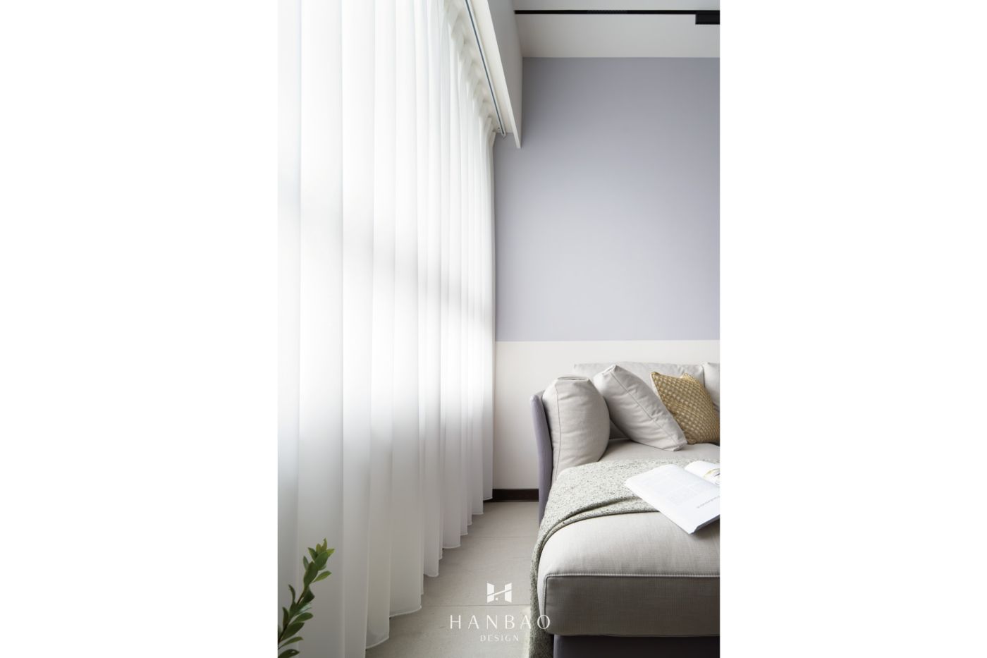 採用低飽和淡紫色與白色做雙跳色,並展現現代風的線條俐落感,延伸視覺,放大空間