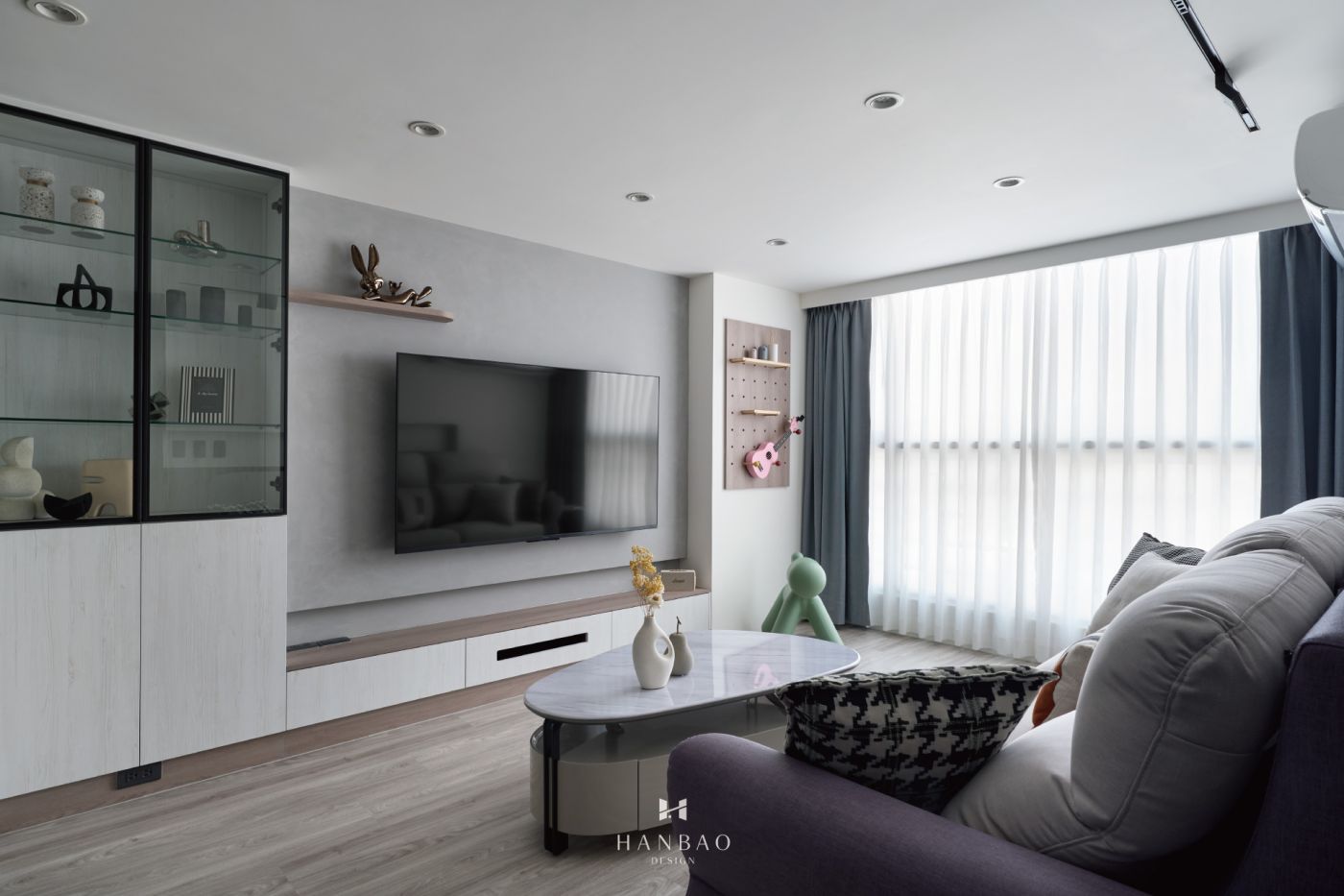 1.電視牆以大面低彩度塗料灰底牆面作為主視覺,讓空間顯得明亮開闊,也能讓家具、陳列物更加突出