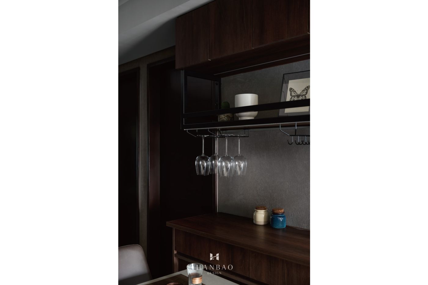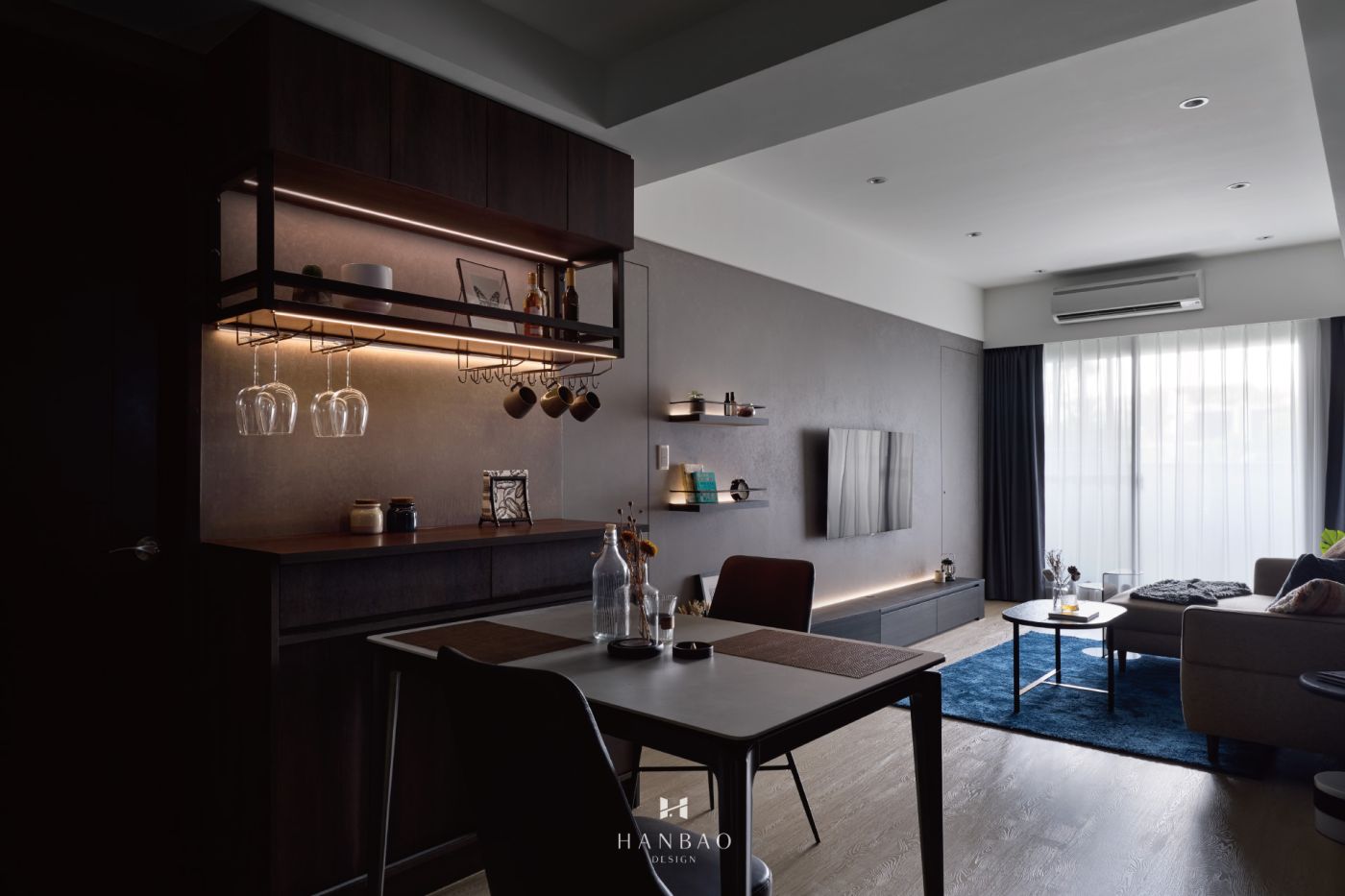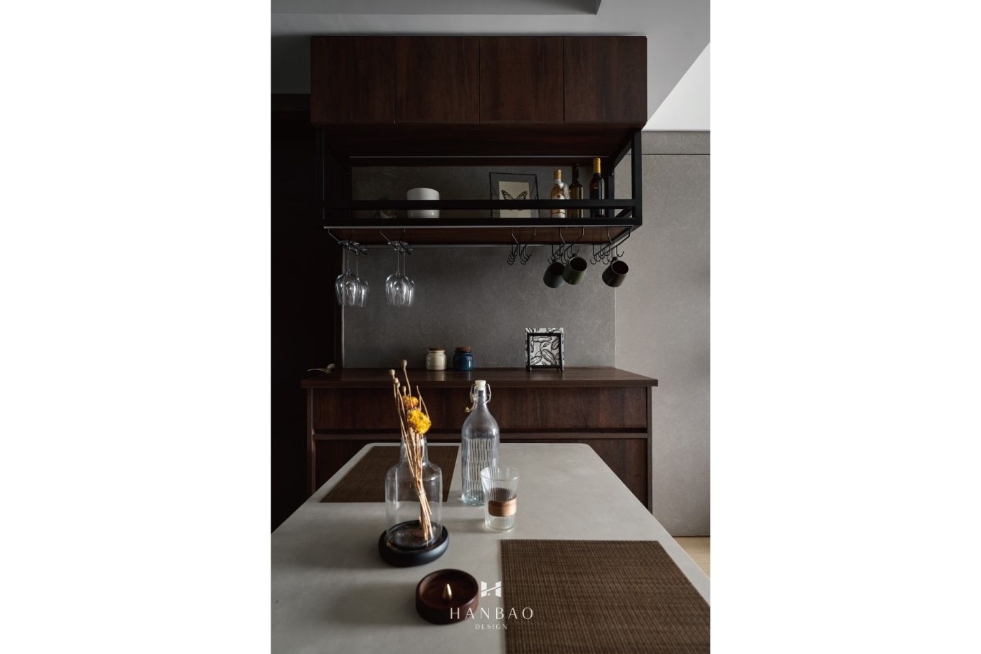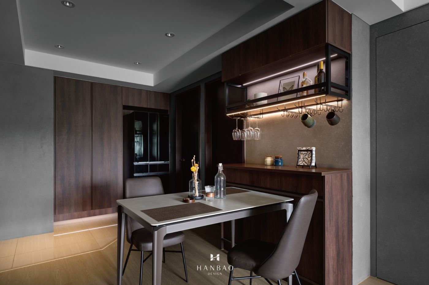 延續整體灰木調性,透過吊燈層次與鐵件線條界定空間,桌面選用深木紋質感,搭配霧黑腳架