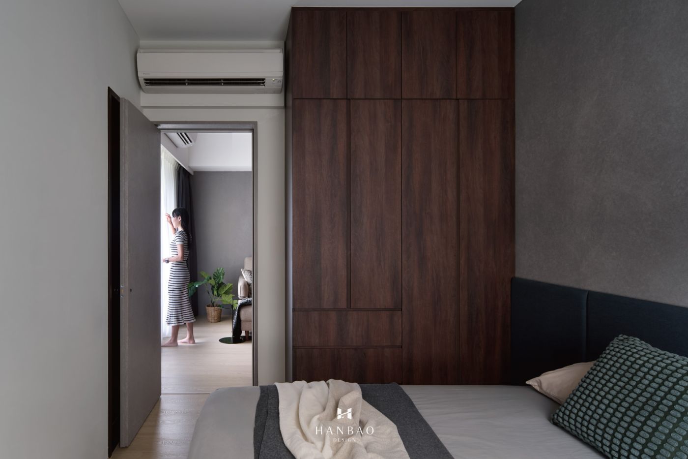 以霧灰藝術塗料鋪陳床頭背牆,結合原木色收納櫃面板,延續整體的灰木調性。也在沉靜層次裡,釋放柔和而穩定的生活節奏